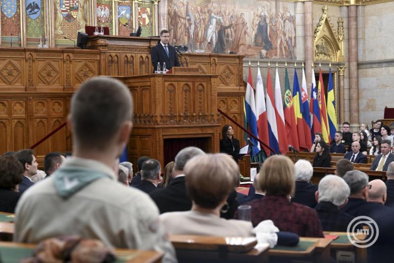 Borítókép: Budapest, 2025. március 7. Gulyás Gergely, a Miniszterelnökséget vezető miniszter beszédet mond a Rákóczi Szövetség Esterházy-díjának átadásán az Országház Felsőházi termében 2025. március 7-én. MTI/Koszticsák Szilárd