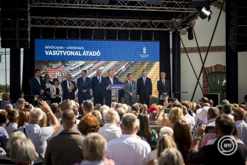 Borítókép: Lőkösháza, 2025. szeptember 23. A Miniszterelnöki Kommunikációs Főosztály által közreadott képen Orbán Viktor miniszterelnök (k) beszédet mond a Békéscsaba és Lőkösháza között megvalósult vasúti vonalszakasz fejlesztésének átadó ünnepségén a lőkösházi vasútállomáson 2025. szeptember 23-án. MTI/Miniszterelnöki Kommunikációs Főosztály/Benko Vivien Cher