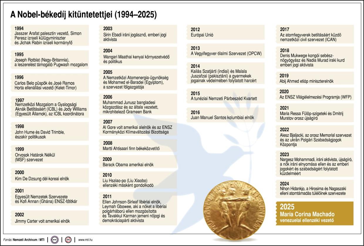 "A Nobel-békedíjat 2025-ben a béke egy bátor és elkötelezett védelmezője kapja, egy olyan nő, aki az egyre erősödő sötétségben is életben tartja a demokrácia lángját"