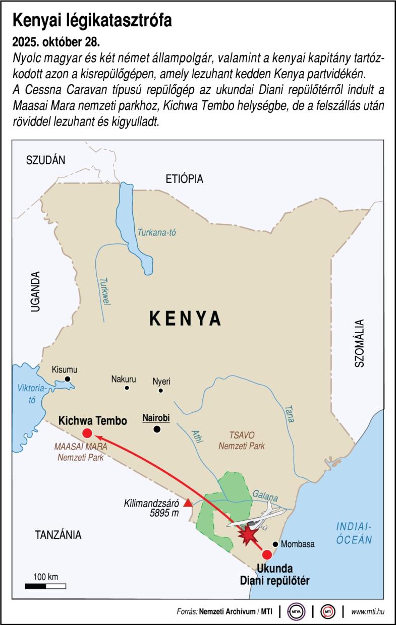 Borítókép: Diani, 2025. október 28. Turistákat szállító kisrepülőgép roncsa, miután lezuhant a kenyai Diani közelében, Kwale megyében 2025. október 28-án. A balesetben a gépet üzemeltető Mombasa Air Safari légitársaság közlése szerint nyolc magyar és két német állampolgár, valamint a kenyai kapitány vesztette életét. MTI/EPA