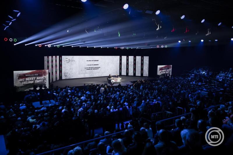 Borítókép: Kecskemét, 2025. december 6. A Miniszterelnöki Kommunikációs Főosztály által közreadott képen Orbán Viktor miniszterelnök (j) a színpadon a digitális polgári körök által szervezett háborúellenes gyűlésen Kecskeméten 2025. december 6-án. Mellette Csiszár Jenő műsorvezető. MTI/Miniszterelnöki Kommunikációs Főosztály/Fischer Zoltán
