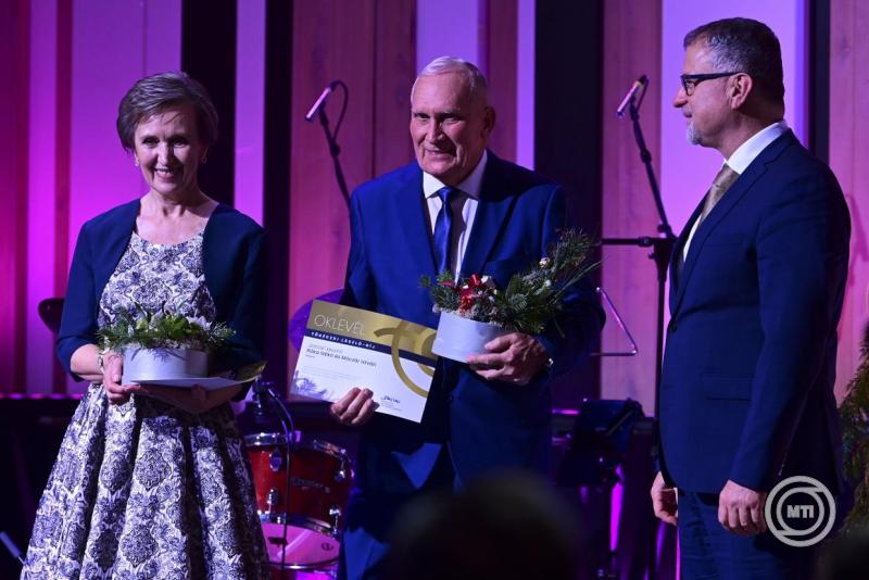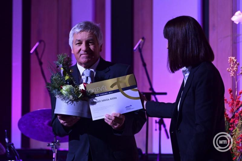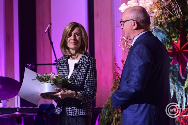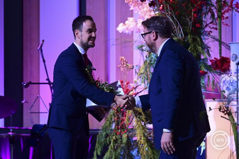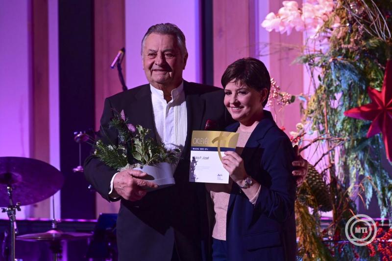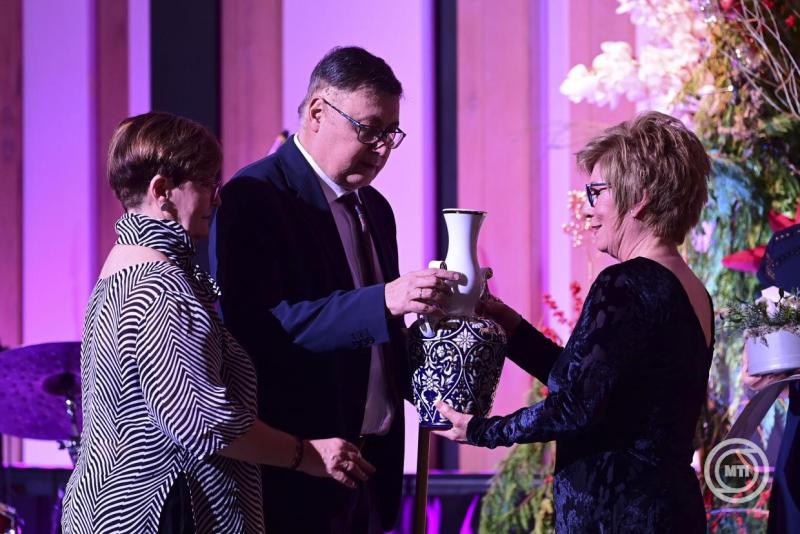 Borítókép: Budapest, 2025. december 11. Altorjai Anita, a Duna Médiaszolgáltató Nonprofit Zrt. vezérigazgatója átadja a Karinthy-gyűrűt Mikó István színművésznek, rendezőnek a Duna Médiaszolgáltató Nonprofit Zrt. által alapított szakmai díjak átadásán a Budapest Music Centerben 2025. december 11-én. MTI/Kovács Attila