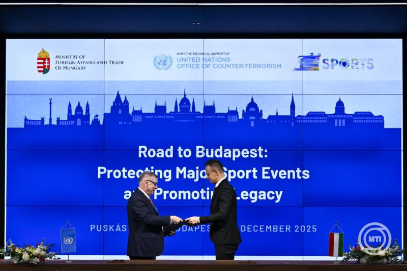Borítókép: Budapest, 2025. december 18. Szijjártó Péter külgazdasági és külügyminiszter (j) fogadja Alekszandr Zoujevet, az ENSZ Terrorizmusellenes Hivatalával (UNOCT) megbízott főtitkár-helyettesét a Puskás Arénában 2025. december 18-án. Előzőleg Szijjártó Péter és Alekszandr Zoujev megállapodást írt alá a sportesemények biztonságának garantálása érdekében, hogy lehetőleg egyetlen mérkőzés se essen áldozatául a biztonsági kihívásoknak. MTI/Hegedüs Róbert