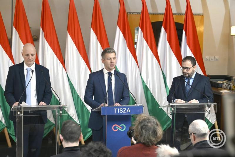 Borítókép: Budapest, 2026. január 5. Magyar Péter, a Tisza Párt elnöke (k) sajtótájékoztatót tart Budapesten 2026. január 5-én. Mellette Tanács Zoltán, a párt kormányzati felkészülést koordináló szakértője (b) és Kármán András, a párt gazdasági szakértője (j). MTI/Bruzák Noémi