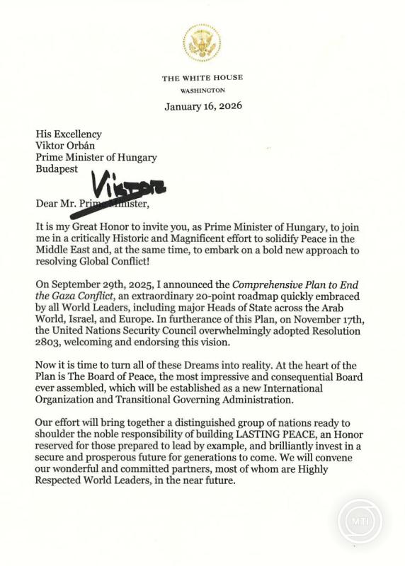 Közzétette vasárnap a Facebookon Orbán Viktor miniszterelnök azt a levelet, amelyben Donald Trump amerikai elnök meghívja Magyarországot a gázai Béketanácsba, és azt is közölte, hogy elfogadta a felkérést.