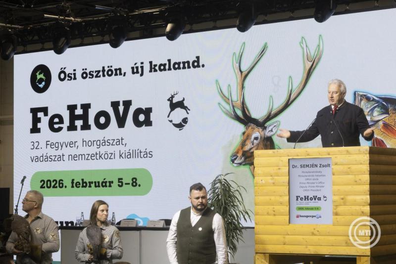 Borítókép: Budapest, 2026. február 5. Semjén Zsolt miniszterelnök-helyettes, az Országos Magyar Vadászati Védegylet elnöke beszédet mond a 32. FeHoVa Fegyver, horgászat, vadászat nemzetközi kiállítás megnyitóján a budapesti Hungexpón 2026. február 5-én. A február 8-ig nyitva tartó rendezvényen 13 országból 200 kiállító mutatja be termékeit. MTI/Kocsis Zoltán