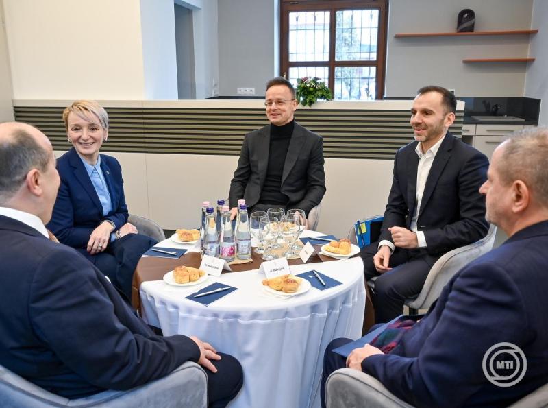 Borítókép: Komárom, 2026. február 9. Szijjártó Péter külgazdasági és külügyminiszter (b3), Czunyiné Bertalan Judit, a térség fideszes országgyűlési képviselője (b2), Molnár Attila polgármester (b1) és Joó István, a Nemzeti Befektetési Ügynökség (HIPA) vezérigazgatója (b4) a Nagyadózók Gyűlése előtt a komáromi Brigetio Öröksége Látogatóközpontban 2026. február 9-én. MTI/Krizsán Csaba
