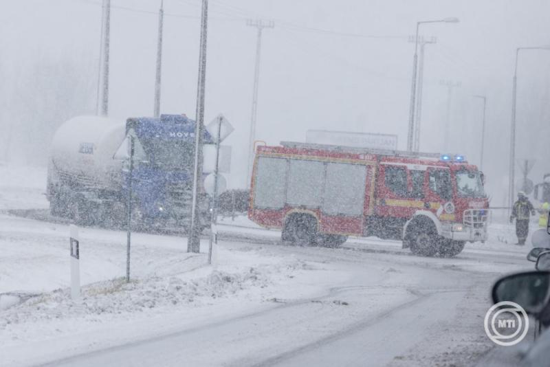 Borítókép: Hévíz, 2026. február 20. Elakadt kamiont vontat egy tűzoltóautó a behavazott 76-os főúton Hévíz közelében 2026. február 20-án. MTI/Katona Tibor
