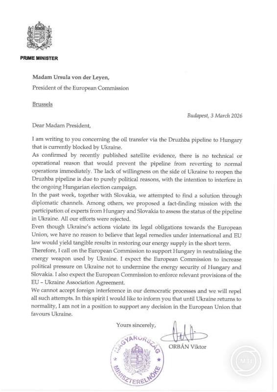 "Ezért felszólítom az Európai Bizottságot, hogy támogassa Magyarországot az ukrán energiafegyver hatástalanításában. Elvárom az Európai Bizottságtól, hogy fokozza a politikai nyomást Ukrajnára annak érdekében, hogy ne ássa alá Magyarország és Szlovákia energiabiztonságát. Elvárom az Európai Bizottságtól azt is, hogy szerezzen érvényt az EU-Ukrajna Társulási Megállapodásban foglaltaknak"