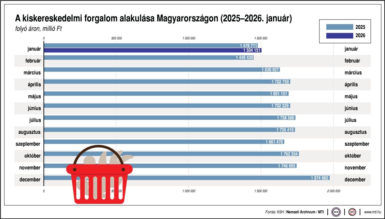 Az élelmiszer- és élelmiszer jellegű vegyes kiskereskedelem értékesítési volumene a nyers adatok alapján 1,2 százalékkal, ezen belül az élelmiszer-kiskereskedelem 77 százalékát adó élelmiszer jellegű vegyes üzleteké 3,7 százalékkal bővült 2025 januárjához képest. Miközben a nem élelmiszer-kiskereskedelem forgalmának volumene a naptárhatástól megtisztított adatok szerint összességében 4,7 százalékkal nőtt. Országos szinten a kiskereskedelmi forgalom januárban meghaladta az 1,5 ezer milliárd forintot.