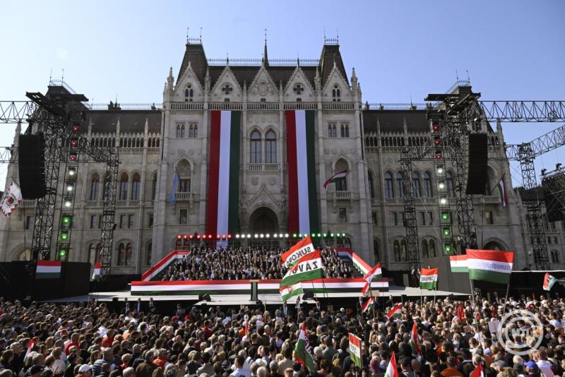 Szijjártó Péter úgy fogalmazott, 178 éve a magyar emberek bizonyították, hogy az egységben erő lakik, és amikor együtt mondjuk el, mit kíván a magyar nemzet, akkor azt meghallják az egész világon, Brüsszeltől Berlinen át Kijevig.