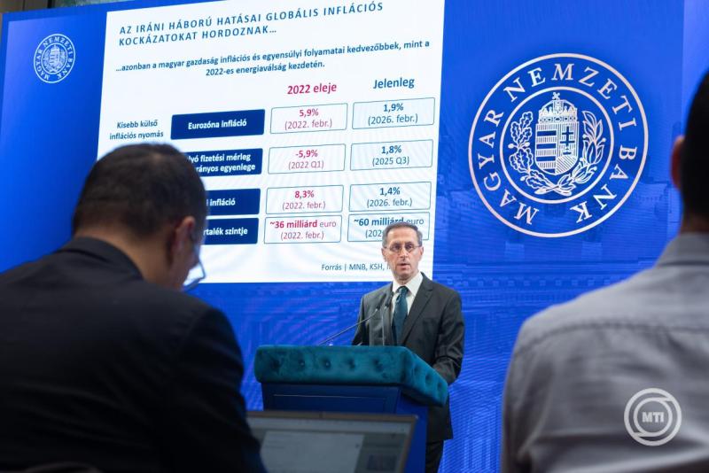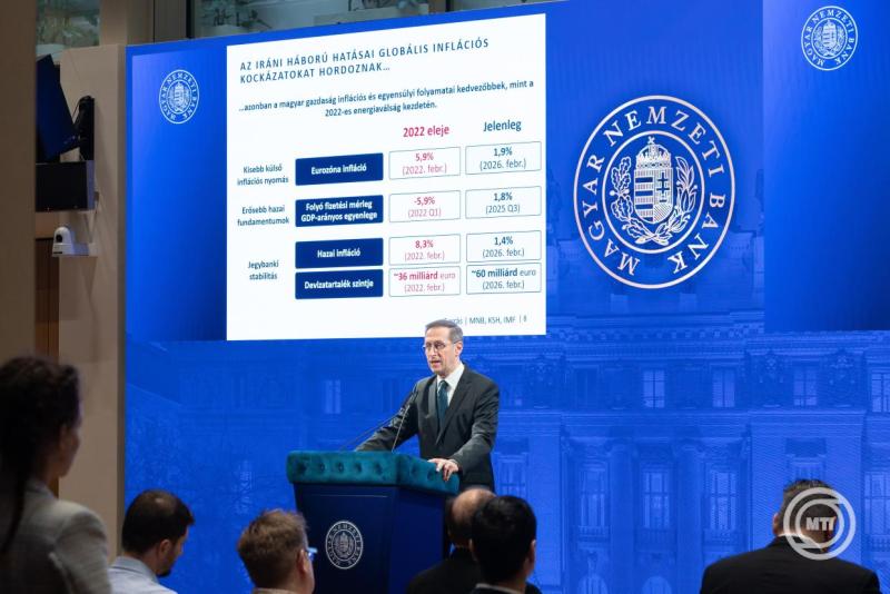 Rámutatott: az iráni háború hatásai globális inflációs kockázatokat hordoznak, azonban a magyar gazdaság inflációs és egyensúlyi folyamatai kedvezőbbek mint a 2022-es energiaválság kezdetén. Az akkori energiaválság a keresleti és kínálati oldal egyensúlytalanságából fakadó inflációs helyzetben érkezett, ezzel szemben a közelmúltban a világpiaci élelmiszerárak tartós mérséklődése volt látható, miközben a pénzügyi piacok is stabilabbak voltak - mondta.