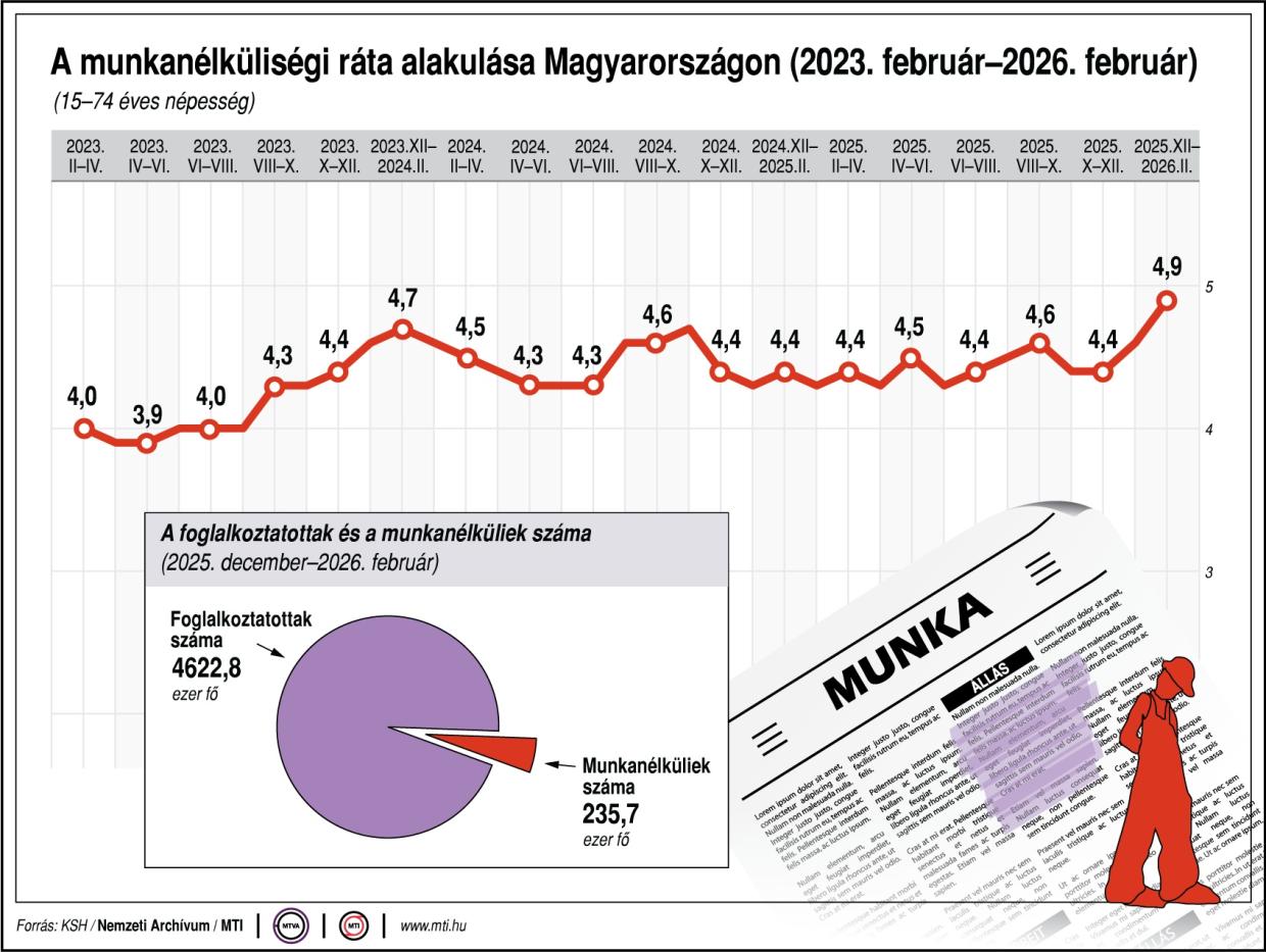 A közleményben a Központi Statisztikai Hivatal adataira hivatkoztak azt írták: 2026 februárjában több mint 4,6 millióan dolgoztak Magyarországon, miközben a regisztrált álláskeresők száma továbbra is rendkívül alacsony szinten maradt. A foglalkoztatotti létszám alakulására meghatározó hatást gyakorol a demográfiai trend, vagyis a munkaképes korú népesség csökkenése. A 15-64 évesek körében a népesség és a foglalkoztatottak számának egyidejű csökkenése mellett a foglalkoztatási ráta érdemben nem változott. A folyamathoz a tartós távollevők létszámának mérséklődése is hozzájárult, de ez nem jelentett állásvesztést. Mindezek ellenére - nemzetközi összehasonlításban - a hazai foglalkoztatás továbbra is magas, a munkanélküliségi ráta pedig alacsony szinten van.