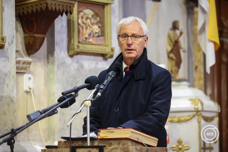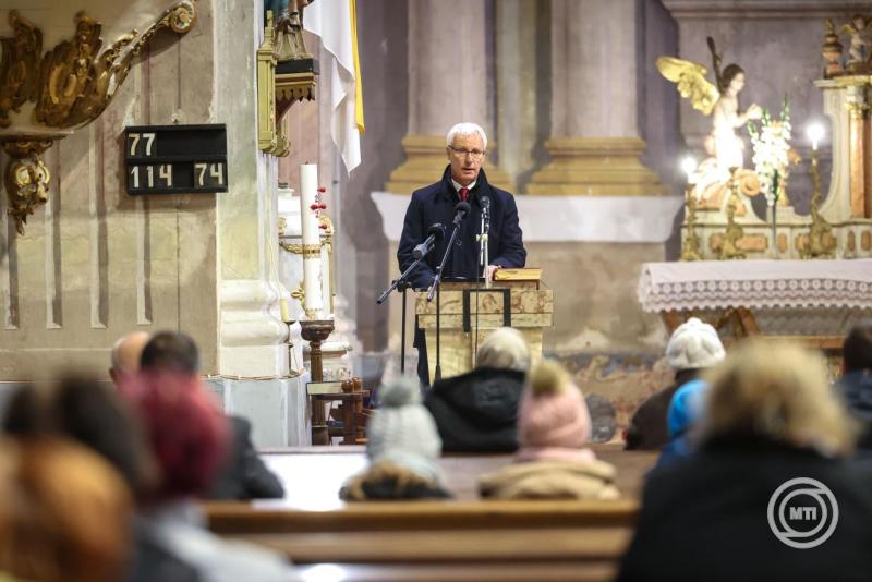 Borítókép: Tevel, 2026. március 29. Soltész Miklós, a Miniszterelnökség egyházi és nemzetiségi kapcsolatokért felelős államtitkára beszédet mond a teveli felújított Szentháromság-templom átadásán 2026. március 29-én. Korábban 105 millió forintos támogatással és kétmillió forintos adományból vonóvasakkal erősítették meg statikailag a templomépületet, valamint megújították a tetőszerkezetet és új tetőt is kapott az épület. Ezúttal megújult a teljes homlokzat és a toronyóra. MTI/Kiss Dániel