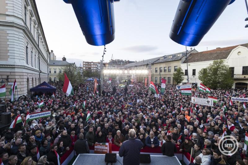 Orbán Viktor úgy fogalmazott, a kampány végére mi vagyunk a hangos többség. Hozzátette: a március 15-i békemenet után indult, "óriási, hatalmas és sikeres kampány" kezdetén is hívei voltak többen, de csendes többséget alkottak, amire "az ellenfél falkában uszult rá" az övéktől eltérő véleményen lévőkre polgári, nemzeti és keresztény elveik miatt.