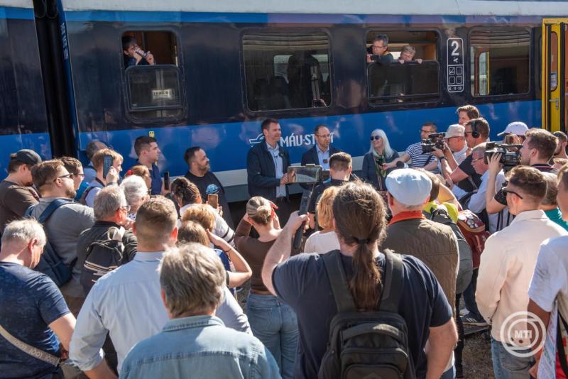 Vitézy Dávid délután civilekkel együtt különvonattal utazott Dombóvárról a mecseki városba a két település közötti, 2023 nyarán bezárt vasútvonallal kapcsolatos emlékmenet keretében.